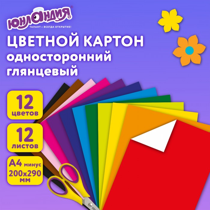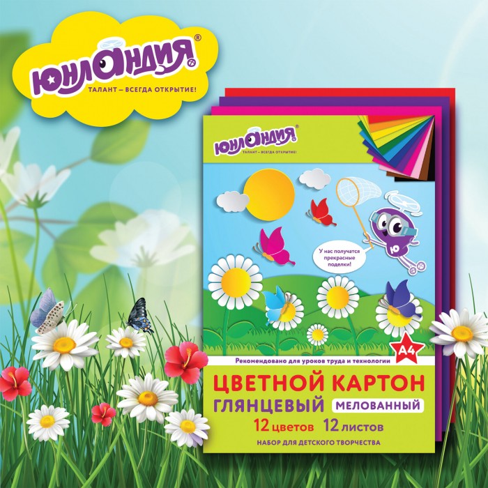 Картон цветной А4 МЕЛОВАННЫЙ (глянцевый), 12 листов 12 цветов, в папке, ЮНЛАНДИЯ, 200х290 мм, "ЮНЛАНДИК НА ПОЛЯНКЕ", 129566