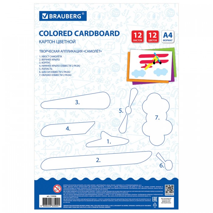 Картон цветной А4 немелованный, 12 листов 12 цветов, в папке, BRAUBERG, 200х290 мм, "Самолет", 113556