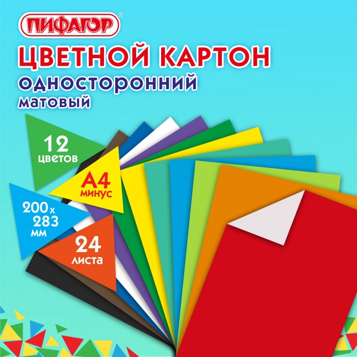 Картон цветной А4 немелованный (матовый), 24 листа 12 цветов, ПИФАГОР, 200х283 мм, 128012