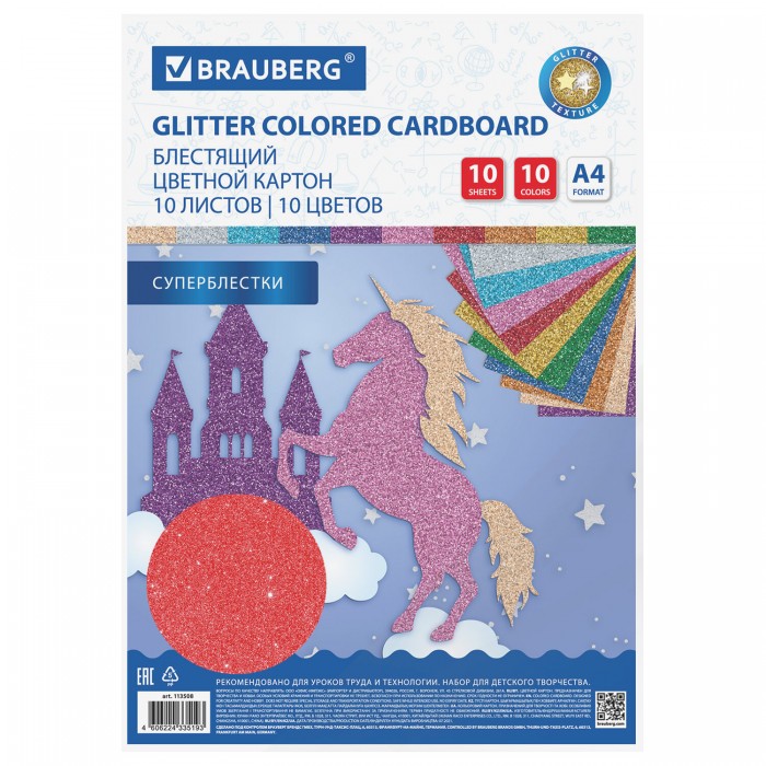 Картон цветной А4 СУПЕРБЛЕСТКИ, 10 листов 10 цветов, 280 г/м2, BRAUBERG, 113508