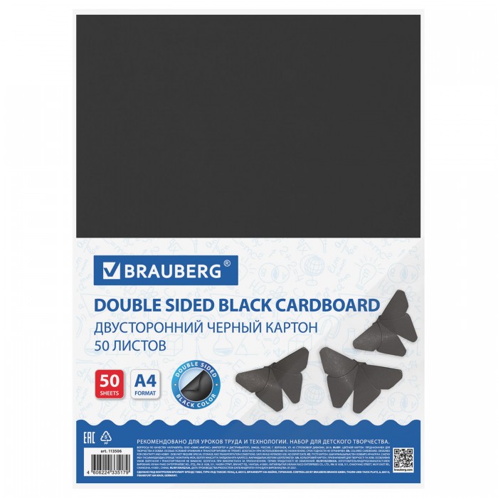 Картон цветной А4 ТОНИРОВАННЫЙ В МАССЕ, 50 листов, ЧЕРНЫЙ, в пленке, 220 г/м2, BRAUBERG, 210х297 мм, 113506