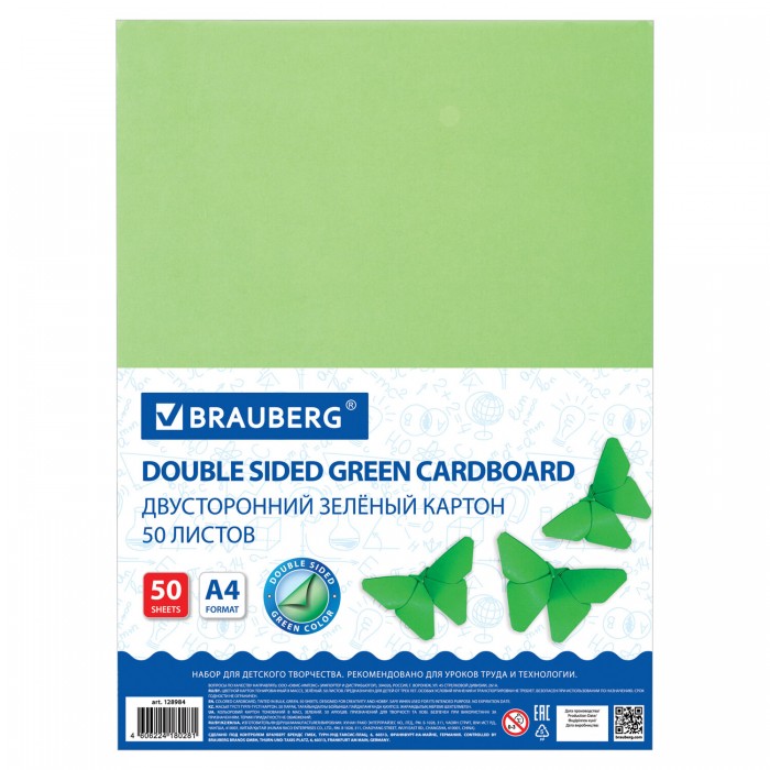 Картон цветной А4 ТОНИРОВАННЫЙ В МАССЕ, 50 листов, ЗЕЛЕНЫЙ, 220 г/м2, BRAUBERG, 210х297 мм, 128984