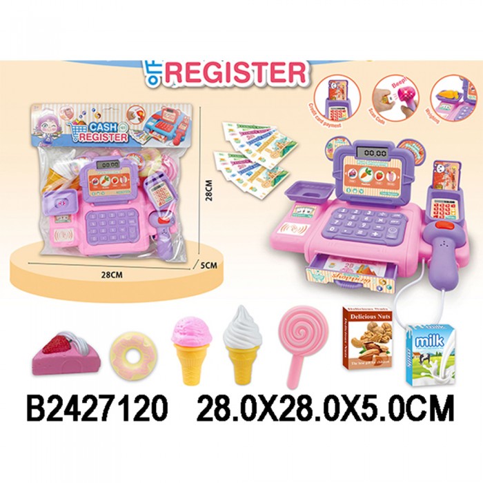 Размер упаковки: 28 х 5 х 28 см Размер изделия: 23 х 14 х 11 см Функционал: набор для игры в магазин Вид упаковки: пакет с хедером Страна производитель: КНР Материал: полимеры Комплектация: набор для игры - 1 шт Возраст ребенка: для детей от 3 лет Набор с кассой «Магазинчик» поможет обучить малыша счёту, объяснить ему, для чего нужны деньги и в чём отличие монет от купюр. Характеристики: - в комплект входит касса со сканером, деньги, кредитная карта, игровые атрибуты; - сканер со звуковыми и световыми эффектами - игрушка воспроизводит мелодии, кнопки при нажатии издают звук - ящик для денег открывается с помощью кнопки - для работы необходимы 2 батарейки АА 1.5 V (не входят в комплект)