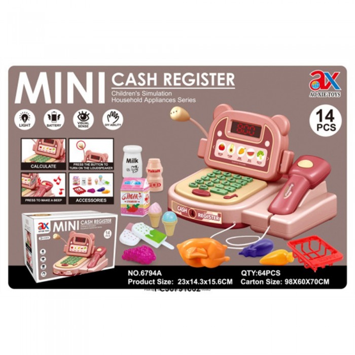 Размер упаковки: 23 х 14,5 х 15,5 см Размер изделия: касса 22 х 14,5 х 19 см Функционал: игровой набор касса Вид упаковки: картонная коробка Страна производитель: КНР Материал: полимеры Комплектация: касса со сканером - 1 шт, продуктовая корзинка - 1 шт, продукты - 13 шт Возраст ребенка: для детей от 3 лет С детским игровым набором "Касса" ребенок окунется в увлекательную игру магазина и научится основам финансов. Особенности: - сканер издает звук при сканировании - открывающийся денежный ящик - на кассе находится кнопка, при нажатии на которую включается микрофон - для работы необходимы 3 батареи АА 1.5V (не входят в комплект) Комплектация: - кассовый аппарат со сканером - продуктовая корзина 9,5 х 6 х 2,5 см - молочный коктейль 3,5 х 3,5 х 5,5 см - молоко 2,7 х 2,7 х 4,2 см - соус 2,5 х 2,5 х 4,5 см - виноград 3 х 6,3 см - баклажан 3 х 6,5 см - эскимо 2 шт 2,7 х 6,5 см - мороженное рожок 2 шт 2,7 х 6,5 см - морковь 3,5 х 7,5 см - курица 4,6 х 6 см - карта 6,6 х 4,5 см