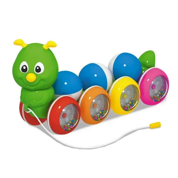 Материал: полипропилен Упаковка: картонная коробка Размер изделия: 25,5 х 10,5 х 13 см, Размер транспортной упаковки: 37,5 х 35,5 х 29,5 мм - картонная коробка Увлекательная каталка «Гусеница с шариками» обязательно понравится вашему малышу! На спинке гусенички расположены 3 бело-голубых шарика. При движении гусенички шарики перекатываются, но не падают. Они легко снимаются и при желании легко возвращаются на свои места. В лапках у гусенички колечко, к которому прикреплена веревочка. Держа веревочку, малыш сможет катать гусеничку. Яркие колеса наполнены маленькими разноцветными шариками, которые при движении пересыпаются и издают приятно-бодрящий звук. Голова гусенички крутится в разные стороны с забавным потрескиванием, мягкие ушки гнутся, а при нажатии на нос-кнопку можно услышать негромкий приветственный писк. Малышам обязательно понравится играть с гусеничкой, она подарит положительные эмоции и прекрасное настроение маленьким непоседам.