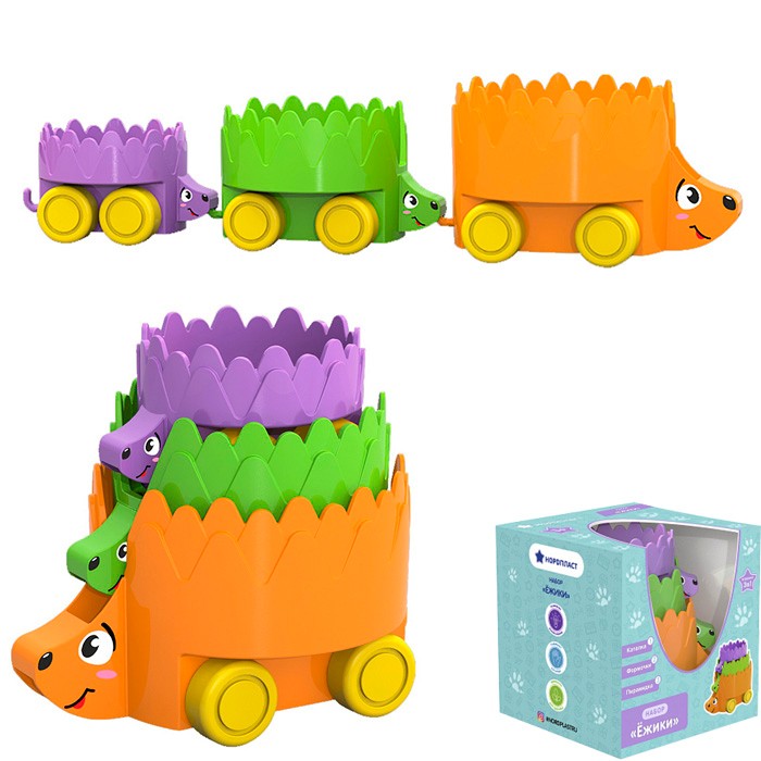 Размер изделия: 13,8x14,2x15 см Состав: пластик Возраст: от 3 лет Упаковка: коробка с окошком Комплектация: 3 детали-формочки Пол: девочки, мальчики Страна изготовления: Россия "Ежики" - это сразу три игрушки в одной: пирамидка, паровозик и формочки. В комплект входят 3 ежика, большой, средний и маленький, которые соединяются в линию или вкладываются друг в друга по принципу пирамидки. Такая игра будет знакомить малыша с понятием "больше-меньше", научит сравнивать размеры, потренирует мелкую моторику и цветовое восприятие.