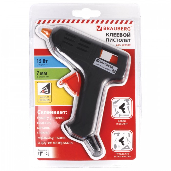 Клеевой пистолет 15 Вт, для стержня 7 мм, BRAUBERG, в блистере, 670322