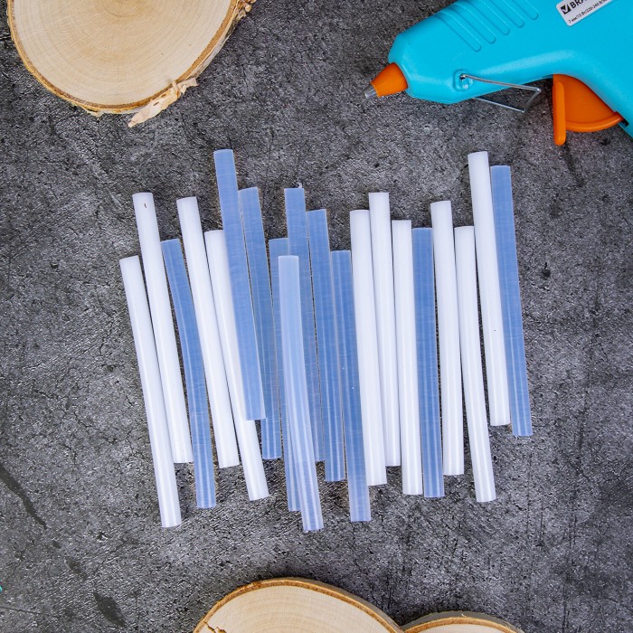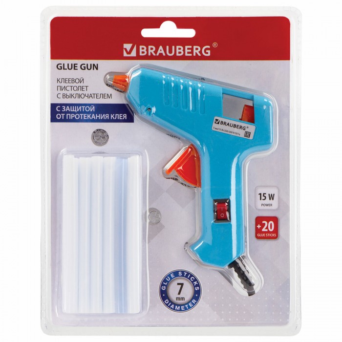 Клеевой пистолет 15 Вт для стержня 7 мм, комплект 20 стержней (10 белых + 10 прозрачных), BRAUBERG, 671052