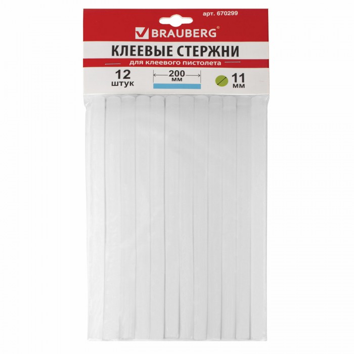Клеевые стержни, диаметр 11 мм, длина 200 мм, белые, комплект 12 штук, BRAUBERG, европодвес, 670299