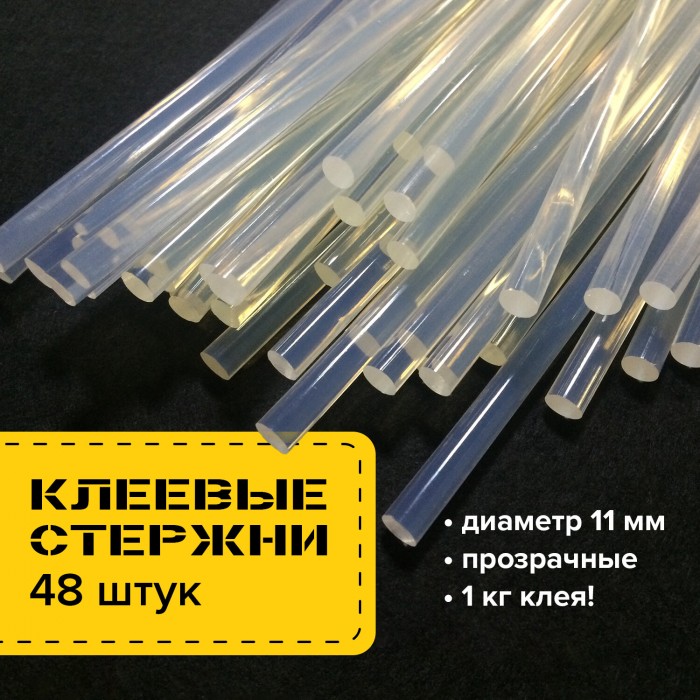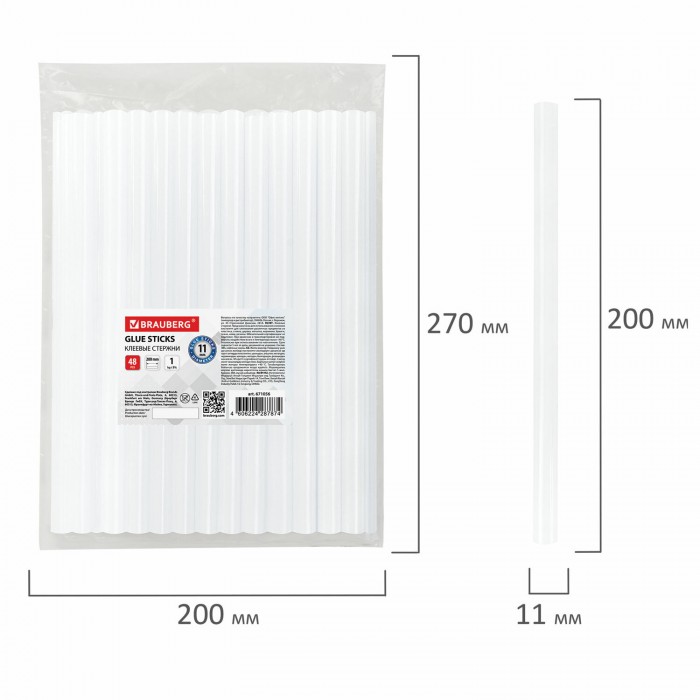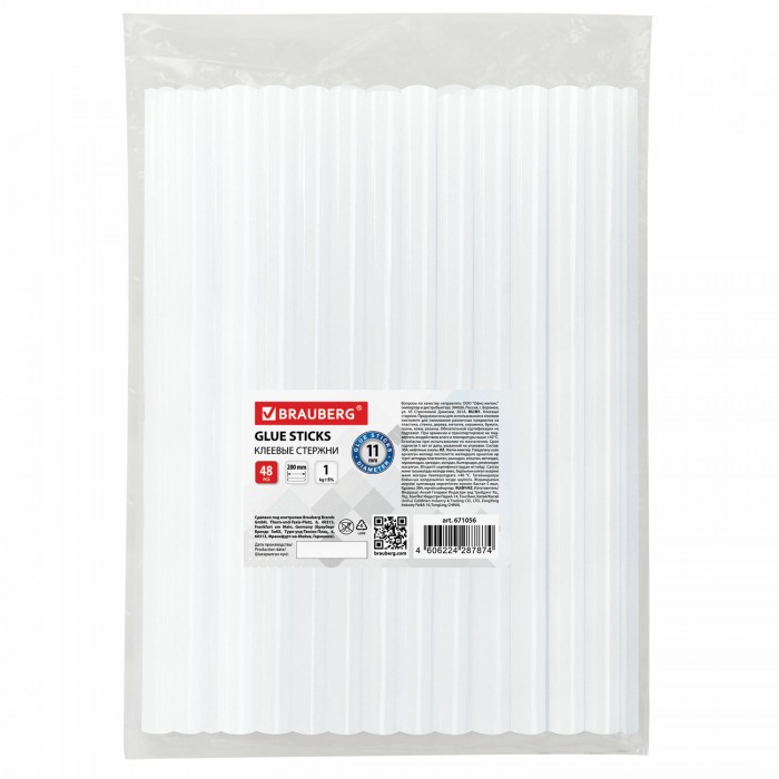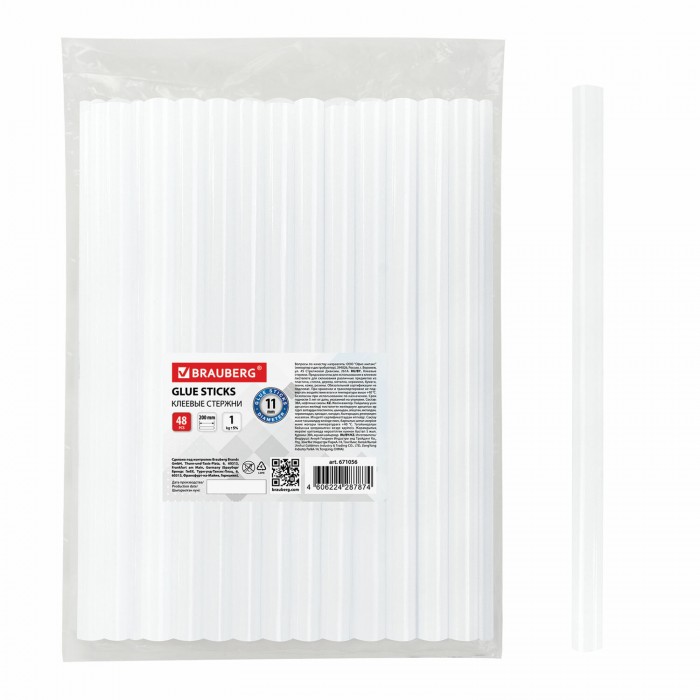 Клеевые стержни, диаметр 11 мм, длина 200 мм, прозрачные, 1 кг (48 штук) BRAUBERG, 671056