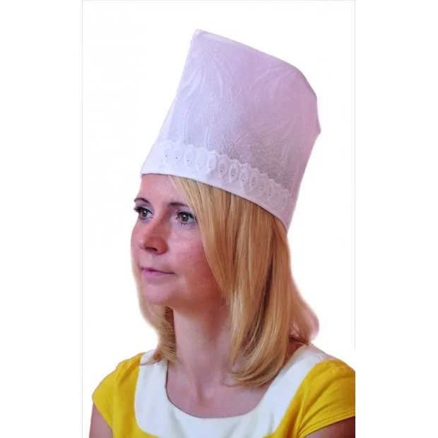 Головной убор (кокошник) с высокой боковой частью. Нижний край с отделкой из тесьмы-шитья. Размер кокошника регулируется завязками сзади, все срезы обработаны капроновым кантом. Головной убор (кокошник) используется в качестве предмета форменной одежды для сотрудников различных отраслей легкой промышленности.