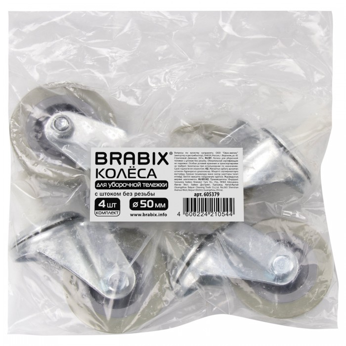 Колеса для уборочной тележки с штоком без резьбы, диаметр 50 мм, КОМПЛЕКТ 4 штуки, BRABIX, 605379