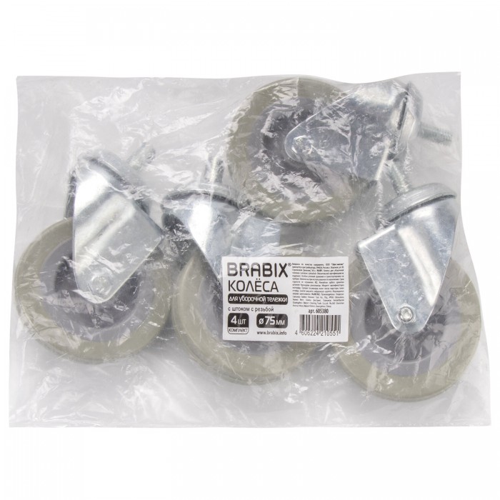 Колеса для уборочной тележки с штоком с резьбой, диаметр 75 мм, КОМПЛЕКТ 4 штуки, BRABIX, 605380