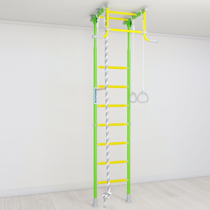 ROMANA R2 быстро собирается и устанавливается. Ширина лестницы - 49 см, ступени массажные, благодаря чему исключается скольжение ног и рук, стимулируется общая моторика. В комплекте в наличии все самое популярное навесное оборудование — трапеция, кольца и канат.
