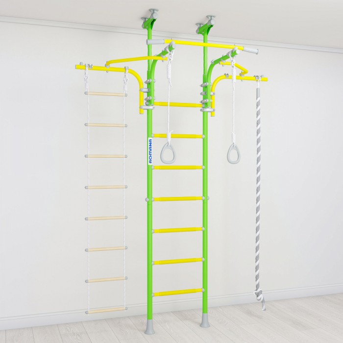 Детский спортивный комплекс ROMANA R6 один из самых увлекательных комплексов для ребенка любого возраста, с креплением пол-потолок (враспор). Его легко установить в любом удобном месте дома или квартиры. Взбираясь по веревочной лестнице, ребенок может ухватиться за перекладину,ведущую к турнику, с него переместиться на канат и затем спуститься вниз- эта мини игра так увлекательна для маленьких искателей приключений. Убрав перекладины можно перемещать турник пониже, для занятий маленьких детей — все делается быстро и легко, благодаря новым хомутам.