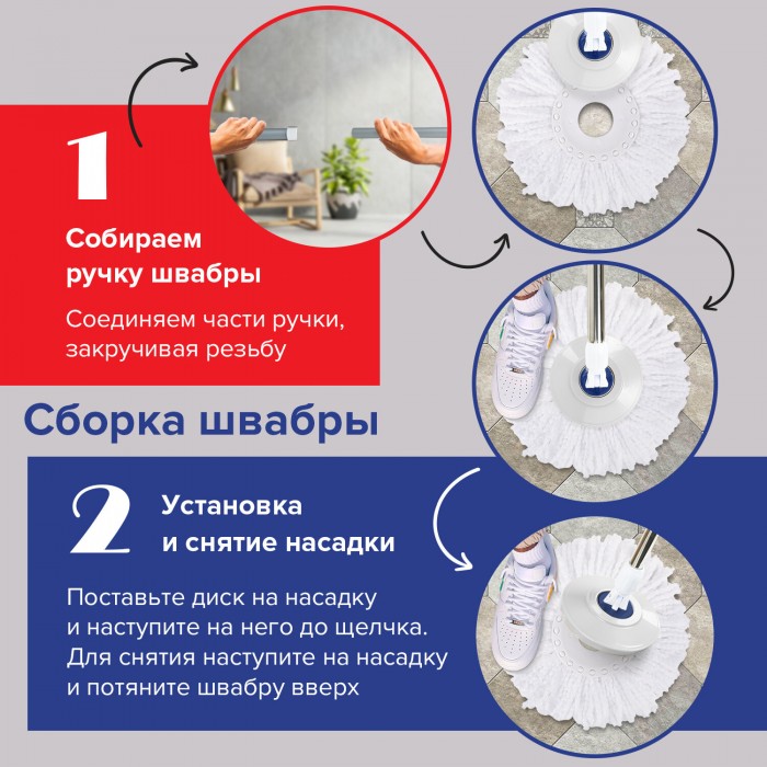 Набор LAIMA предназначен для проведения уборки небольших помещений. Швабра отлично собирает влагу и грязь, идеальна для дома и офиса. СУПЕР современный и удобный способ отжима насадки МОП посредством центрифуги, приводимой в действие нажатием педали.