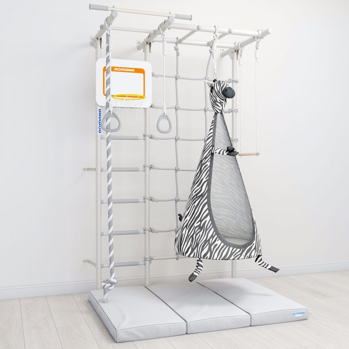 Комплекс включает в себя следующие элементы навесного оборудования: канат, кольца, веревочный лаз, рукоход, трапеция, турник и баскетбольный щит. Шведскую стенку дополняет уютный гамак «Зебра». Разнообразие элементов значительно расширяет функции шведской стенки и способствует всестороннему физическому развитию.