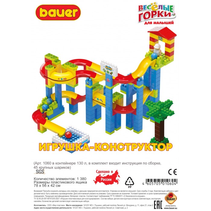 Конструктор Bauer "Веселые горки для малышей" (в контейнере 130 л, 15 инструкций, тематические наклейки)