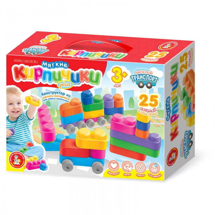 Конструктор Десятое королевство "Мягкие кирпичики plus. Веселый транспорт", 25 деталей + колесики, картонная коробка