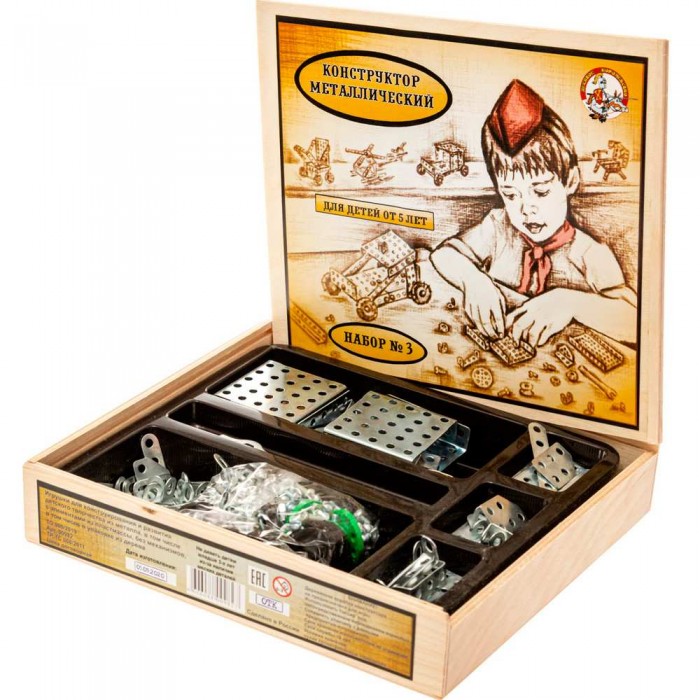 Комплектация: детали конструктора, инструкция, инструменты, шурупы, гайки Материал: металл Размер упаковки: 23*21*4,5 см Возраст: 5+ Функционал: конструирование Упаковка: деревянный ящик Страна обладатель бренда: Россия Конструктор №3 от торговой марки "Десятое королевство" представляет собой классический металлический конструктор. В комплекте есть подробная иллюстрированная инструкция с пошаговыми рекомендациями. Начинать работу над конструктором лучше всего с примеров, описанных в ней. Представленные модели являются только примером, так как конструктор раскрывает перед ребенком неограниченные возможности моделирования и создания своих собственных моделей. Он отлично развивает конструкторское, инженерное мышление. Металлические детали очень удобны в применении. Металлический конструктор сложнее пластикового в техническом плане, тем самым, он имеет больший развивающий потенциал. Конструирование развивает логическое и образное мышление, наблюдательность и самостоятельность, а также моторику рук и ловкос