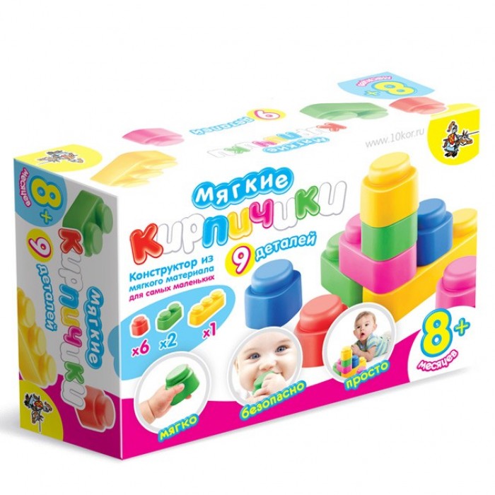 Размер упаковки- 25*17,5*8 см Вес: 420 г. Рекомендуемый возраст: от 0 лет до 3-х лет Специальный материал, крупные элементы, «бархатистые» и удобные для детской ручки- мы специально создавали конструктор Мягкие кирпичики 9 деталей для самых маленьких. Конструктор изготовлен из полимера, используемого в основном для производства предметов гигиены и в пищевой промышленности. Они легко соединяются и разъединяются, при этом до определенной степени сминаются и ими практически невозможно нанести травму себе или окружающим. Прекрасный тренажер для развития кисти рук, координации движений и развития пространственного мышления. Девяти элементов вполне достаточно для построения несложных конструкций.