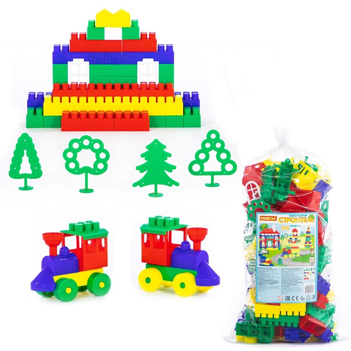 Размеры упаковки: 22х20х43,5 см Состав: пластик Комплектация: 175 деталей Страна-производитель: Беларусь Конструктор "Строитель" Макси-плюс состоит из 175 элементов различных форм и цветов. В набор входят детали для создания паровозика, домов, замков, а также деревья, которые помогут придать завершенный вид сказочному городку. Все элементы плотно соединяются друг с другом, а также легко расцепляются, имеют гладкие поверхности без зазубрин, и изготовлены из качественных безопасных материалов. Игра с таким конструктором поможет ребенку в развитии мелкой моторики, пространственного мышления, воображения и цветового восприятия. Цвета представлены в ассортименте.