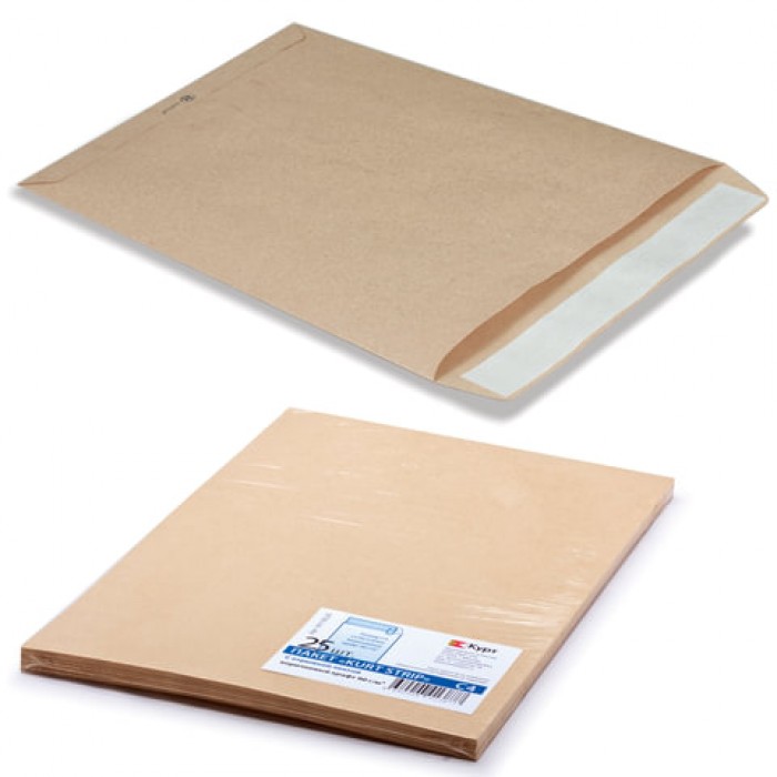 Конверт-пакеты С4 плоские (229х324 мм), до 90 листов, крафт-бумага, отрывная полоса, КОМПЛЕКТ 25 шт., 161150.25