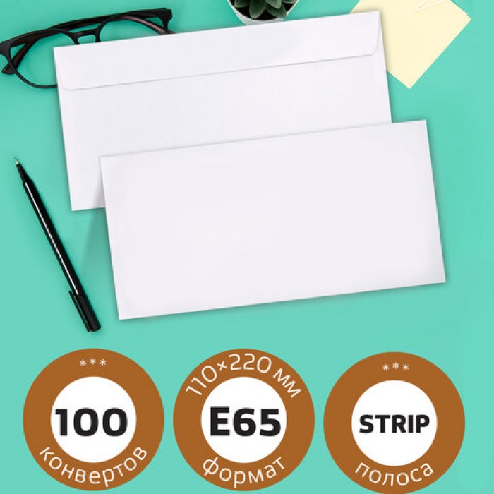 Конверты Е65 (110х220 мм), отрывная лента, внутренняя запечатка, КОМПЛЕКТ 100 шт., BRAUBERG, 112193