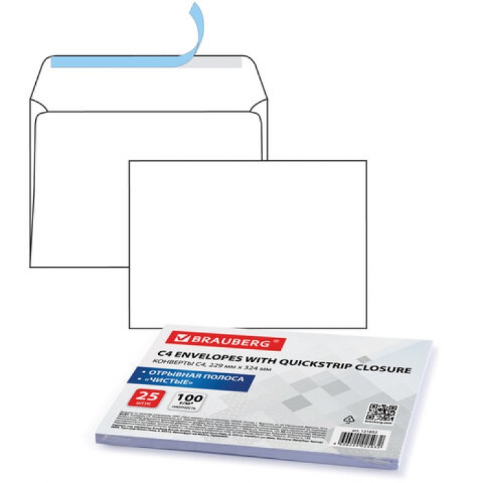 Конверты С4 (229х324 мм), отрывная лента, 100 г/м2, КОМПЛЕКТ 25 шт., BRAUBERG, 121852