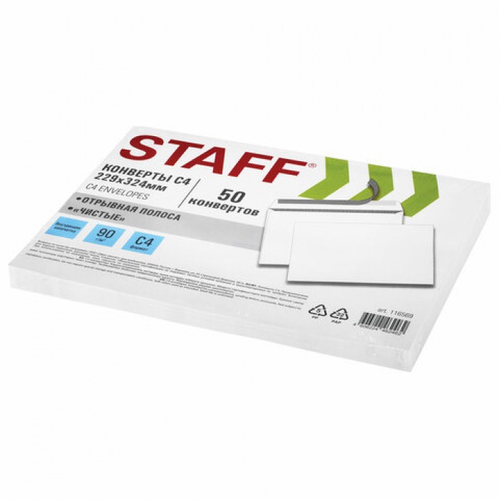 Конверты С4 (229х324 мм), отрывная лента, 90 г/м2, КОМПЛЕКТ 50 шт., внутренняя запечатка, STAFF, 116569