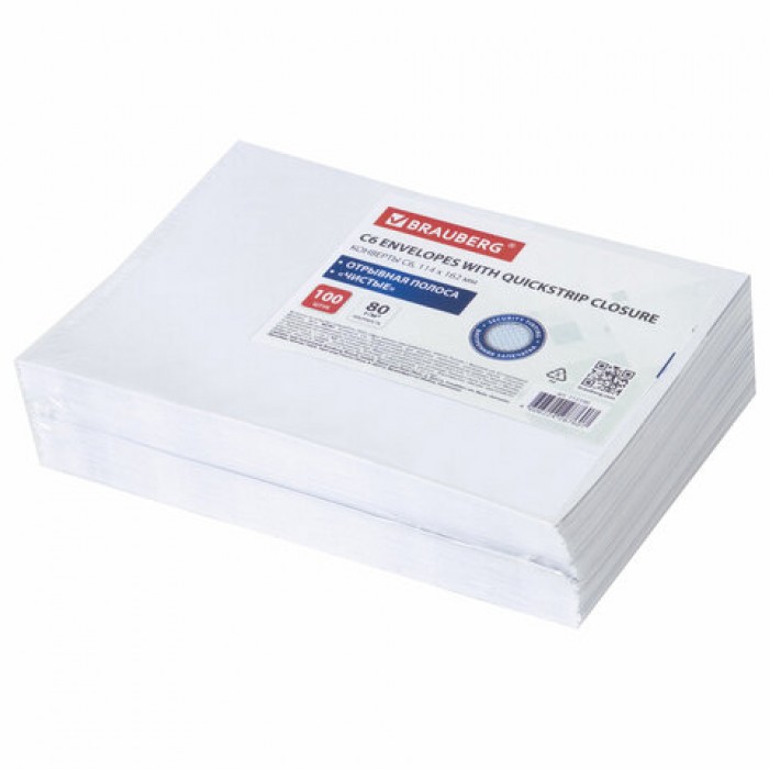 Конверты С6 (114х162 мм), отрывная лента, внутренняя запечатка, 80 г/м2, КОМПЛЕКТ 100 шт., BRAUBERG, 112190