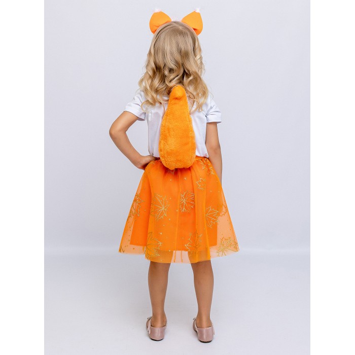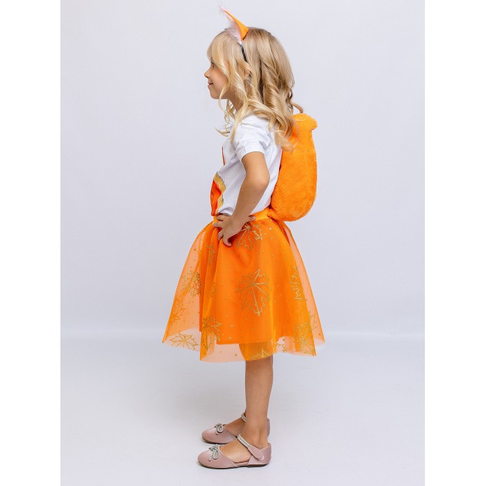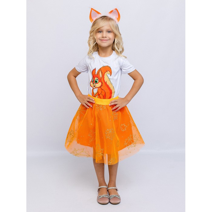Карнавальный костюм Белочки детский от batik. Комплект включает ушки на ободке, футболку с принтом в виде белочки, юбку из сетки и съемный хвост. Юбка оранжевая, сшита из фатина средней жесткости и хлопка, она прекрасно держит форму. Удобство костюма состоит в том, что его детали можно носить отдельно друг от друга в повседневной жизни.