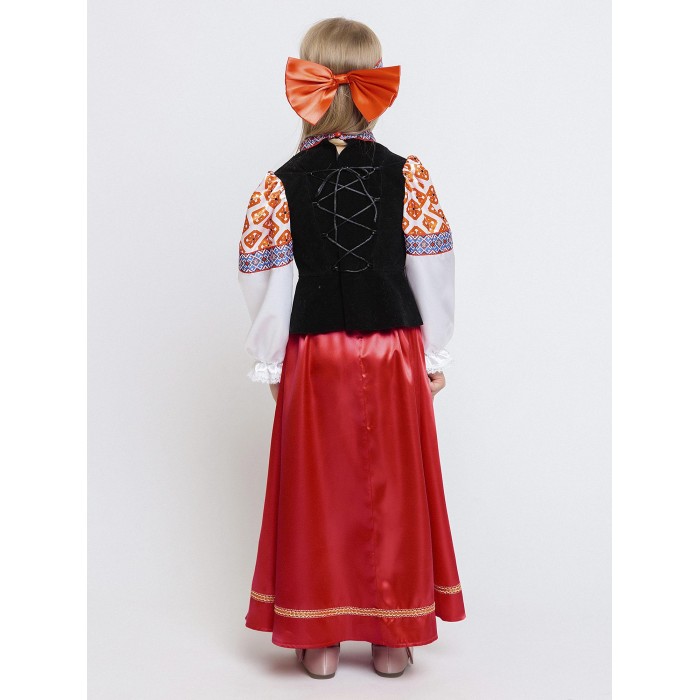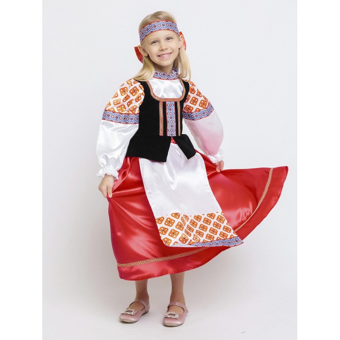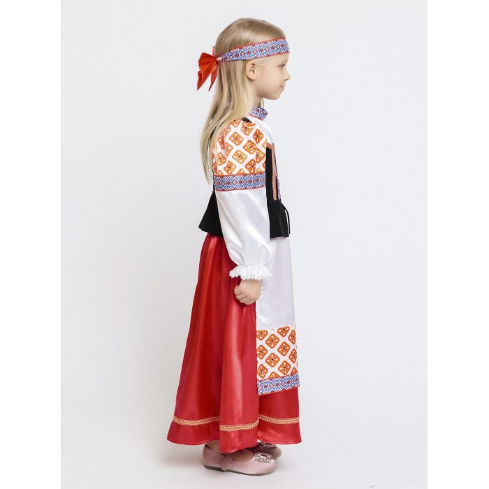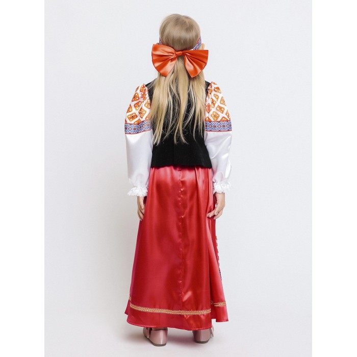 Карнавальный костюм для девочки Дарёнка - красивый образ в народном стиле для выступлений и утренников. В комплекте блузка с длинными рукавами, длинная юбка и повязка с орнаментом. Блузка с вшитой черной жилеткой и узорами. Юбка красная с вшитым передником. Повязка на голову украшена объемным красным бантом сзади. Карнавальный костюм позволит почувствовать себя царевной из русской сказки.