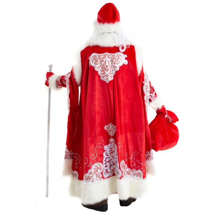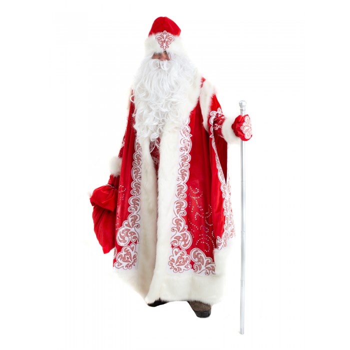 Костюм Дед Мороз Боярский Батик - эффектный и дорогой наряд для тех, кто хочет выглядеть как настоящий новогодний волшебник. В комплект костюма, пошитого из красной парчи и белого меха, входит шуба, шапка, варежки, мешок, посох, парик, борода, рубашка.