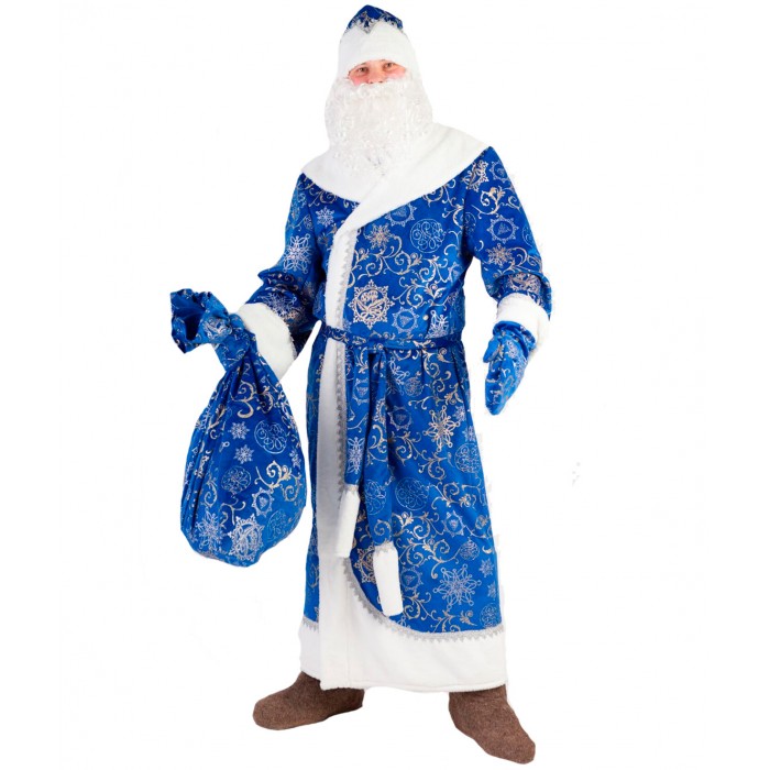 Костюм Деда Мороза в синей расцветке для взрослых. Эффектный новогодний образ для утренников и корпоративов. В комплект входит шуба с поясом, мешок для подарков, борода, шапка и варежки.