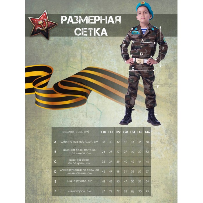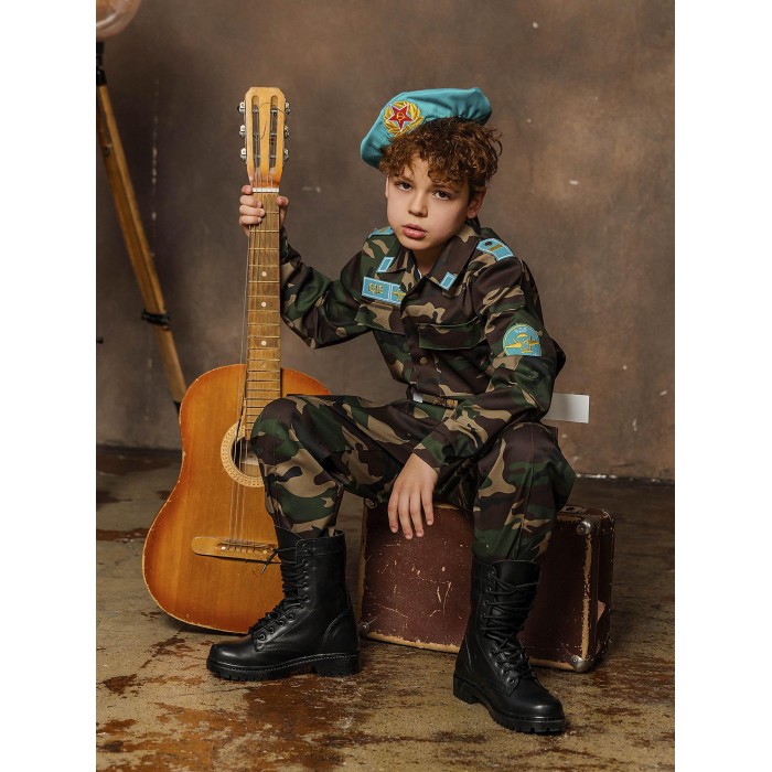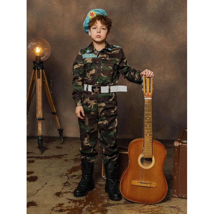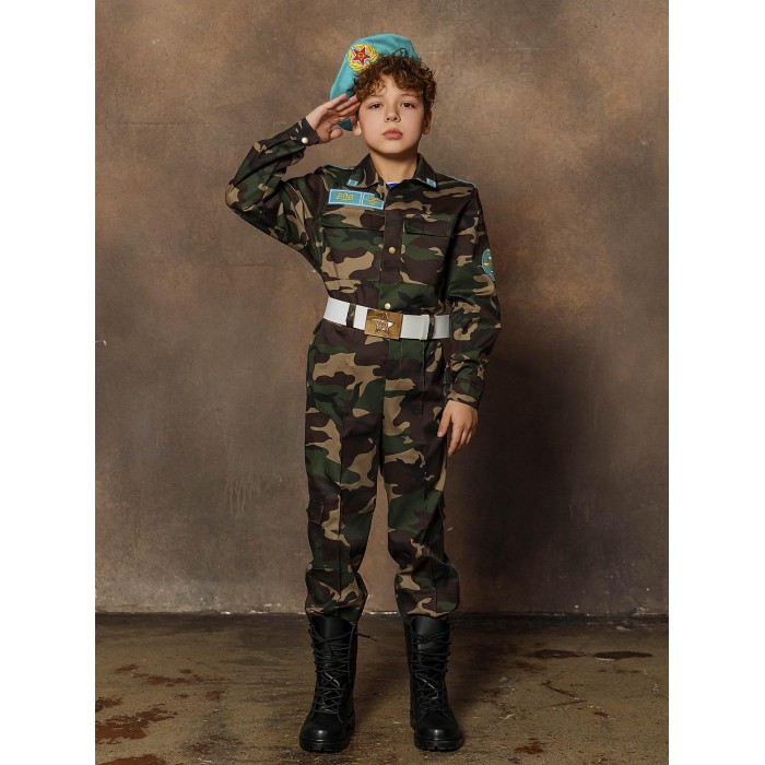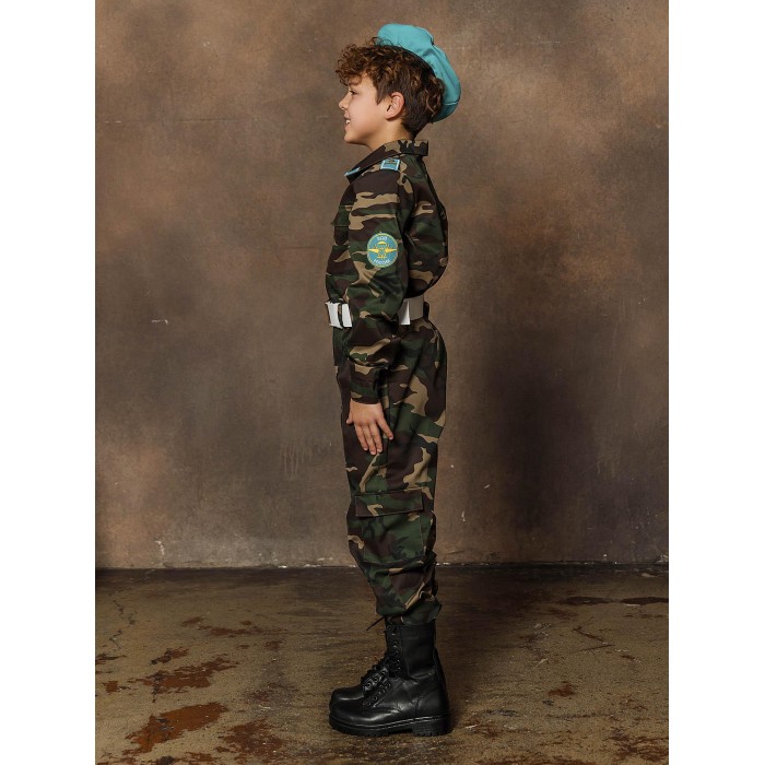Детский костюм Десантник – точная копия формы воздушно-десантных войск. В таком костюме мальчик сможет оригинально поздравить папу или дедушку на день ВДВ или 23 февраля, а еще поучаствовать в костюмированном праздничном выступлении. Костюм включает в себя рубашку и брюки с камуфляжной расцветкой, майка в полоску, берет и ремень.