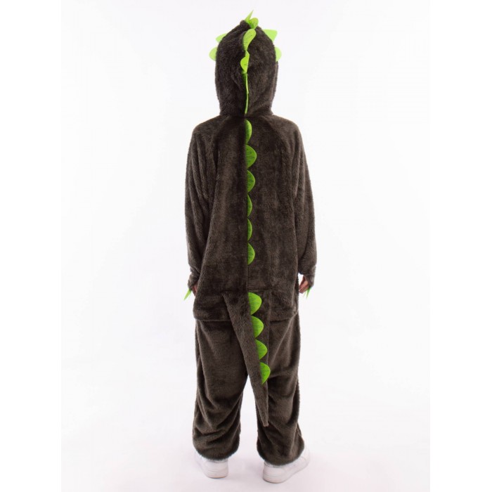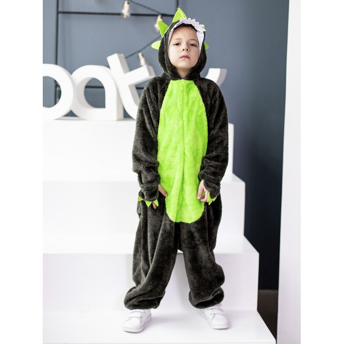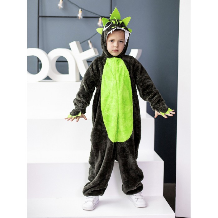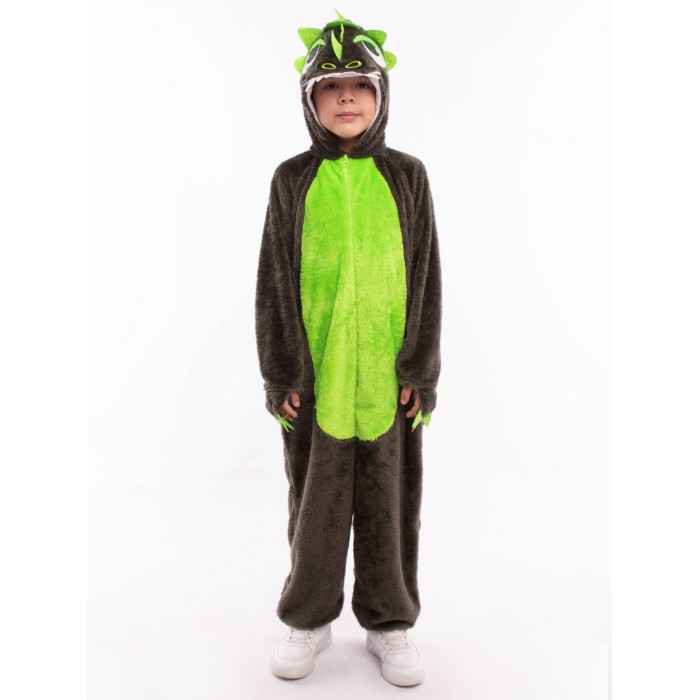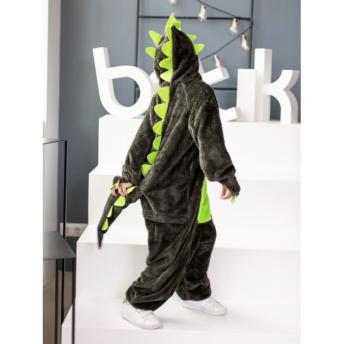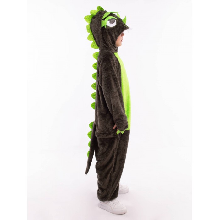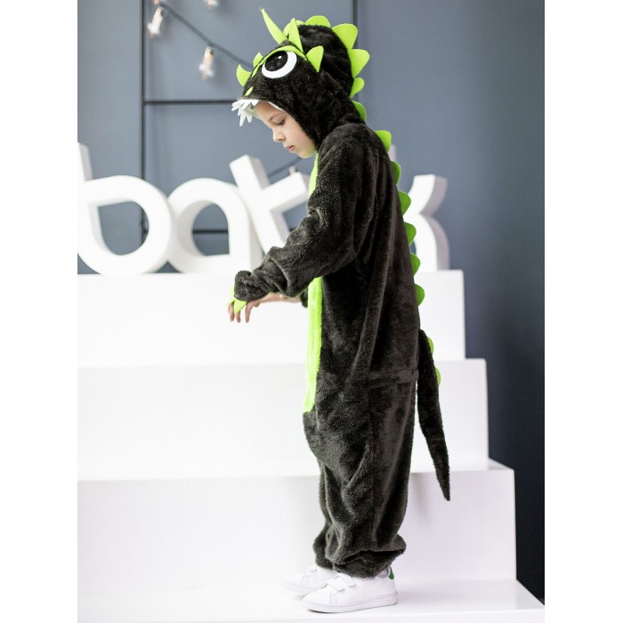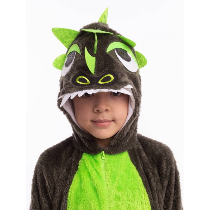 Костюм Динозавр Рекс детский представляет собой кигуруми темного цвета с салатовыми вставками. Капюшон с фетровыми нашивками, застежка-молния по центру спереди, длинные рукава и брючины. Рукава и брючины на резинке. Сзади хвост и застежка на молнию.