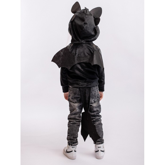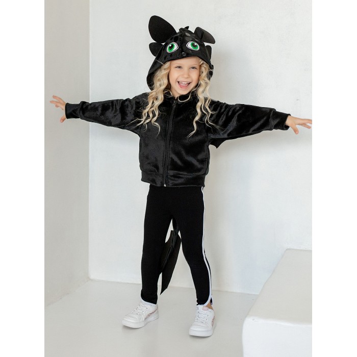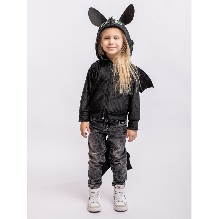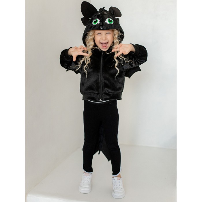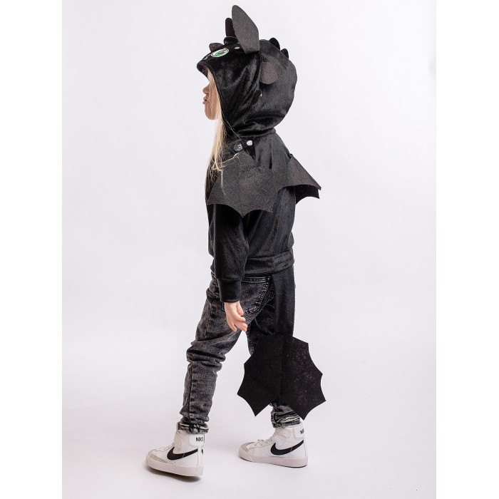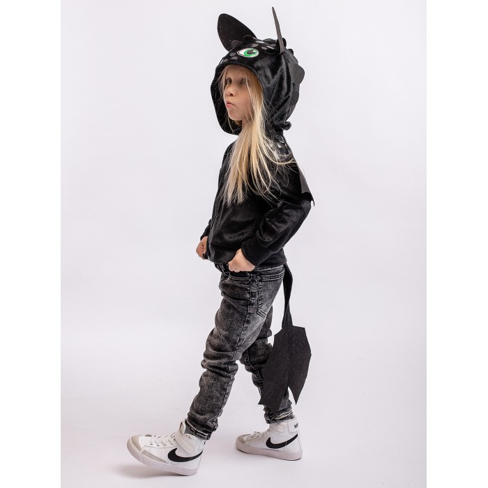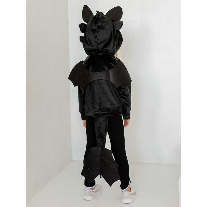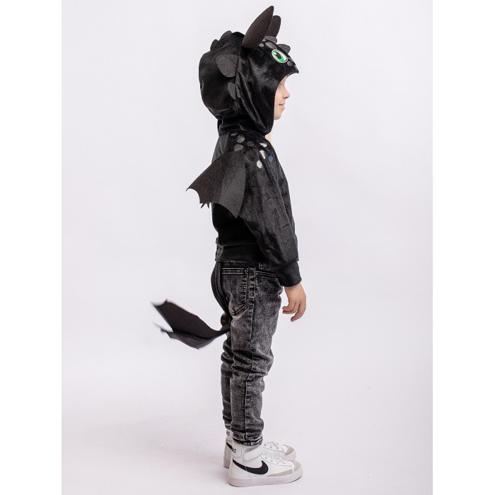 Карнавальный костюм Дракоша детский черный. Представлен в виде худи с капюшоном на молнии. Крылья и хвост съемные на застежке велкро, по бокам есть карманы. В капюшоне хлопковый подклад.