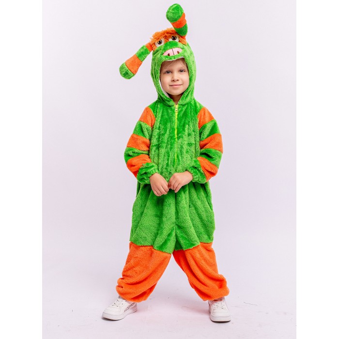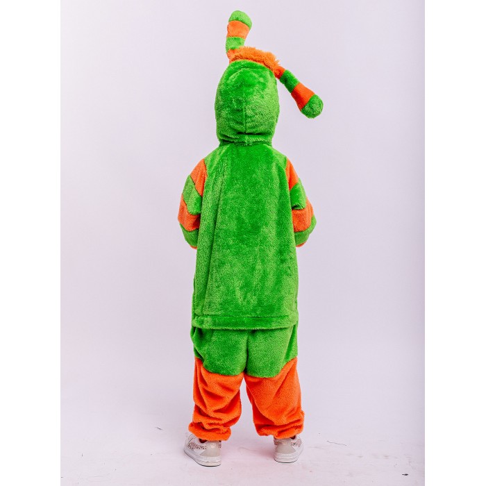 Яркий карнавальный костюм Финник: оранжево-зеленый кигуруми с капюшоном на застежке-молнии. На капюшоне ушки и мордочка персонажа. Финник — персонаж из детского мультсериала «Финник» от создателей «Смешариков». Это добрый и забавный домовой, но немного вредный и озорной, он тайно обитает в мире людей, чтобы заботиться о доме и хранить домашний очаг.