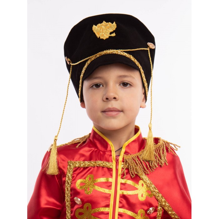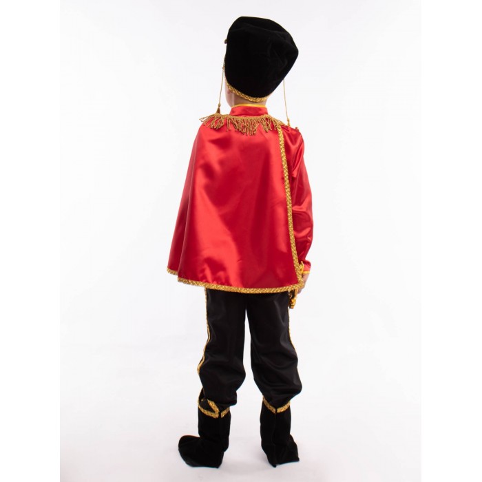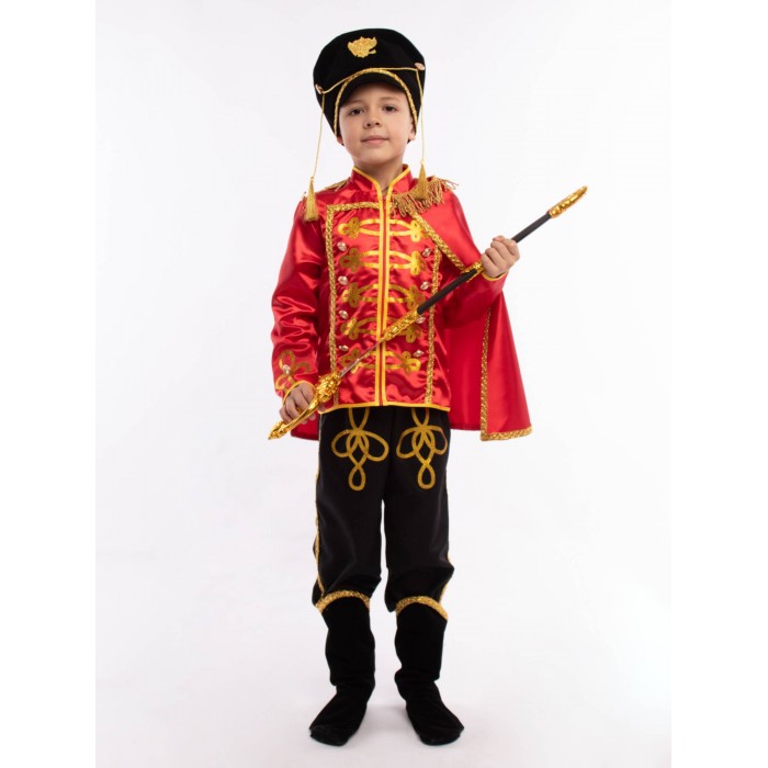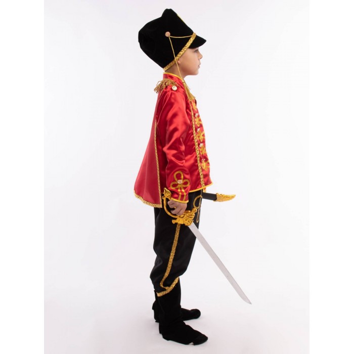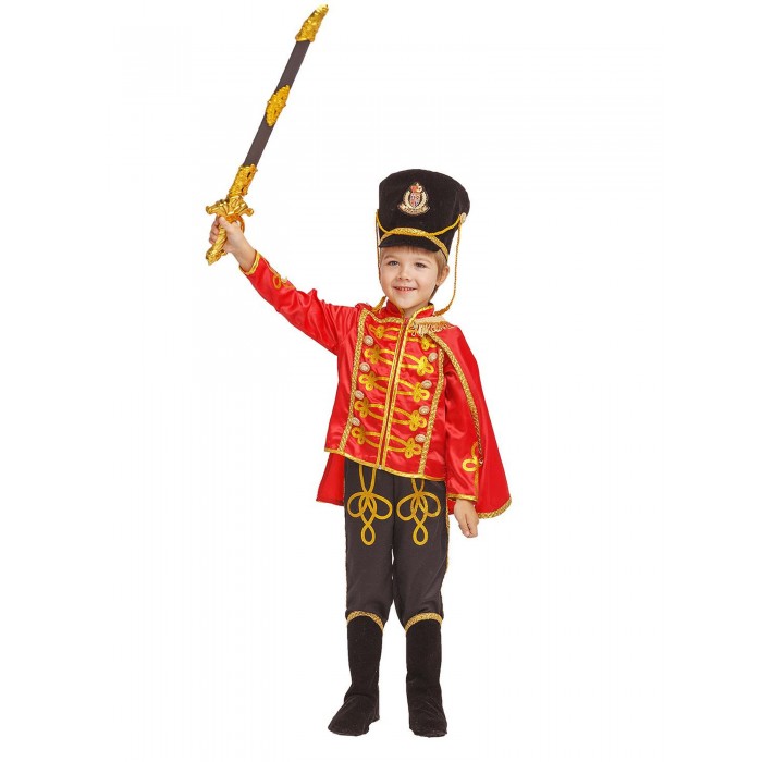 В карнавальном костюме "Гусар" легко почувствовать себя лихим воякой, рвущимся в бой. Такой яркий образ обязательно понравится всем мальчикам. Отлично подойдет для спектаклей, представлений, маскарада или детского утренника. Костюм, состояющий из мундира, кивера, брюк с сапогами и плаща, будет прекрасно смотреться на мальчике любой комплекции. Дополнен костюм пластиковой саблей.