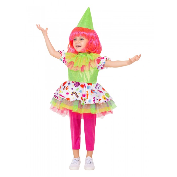 Карнавальный костюм Клоунессы детский от бренда Пуговка. Яркий и веселый костюм, в комплект которого входит платье, бриджи, колпак, парик.