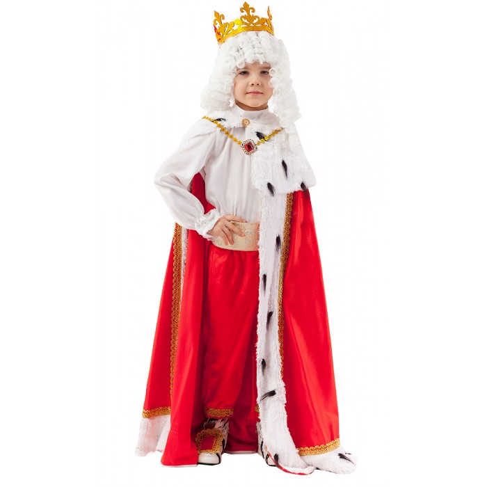 Костюм Короля – шикарный маскарадный образ для мальчиков, который подойдет для спектаклей, новогодних елок и утренников. А еще в этом костюме будет эффектно выглядеть именинник в свой день рождения, особенно если праздник будет проходить в костюмированном стиле. Комплект костюма Короля для мальчика состоит из рубашки, брюк, мантии, пояса, накладок на обувь, подвески, парика и короны.