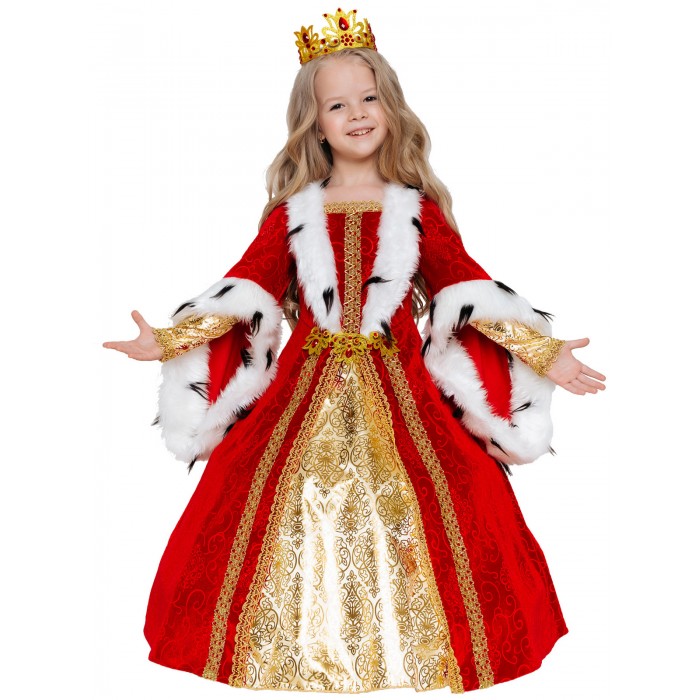 Костюм Королевы для девочки на утренник в детский сад или школу. Роскошный образ из новой коллекции бренда Пуговка, который приведет всех в восторг. Нарядное и по-королевски шикарное платье из красного бархата дополняет золотая корона с камнями.