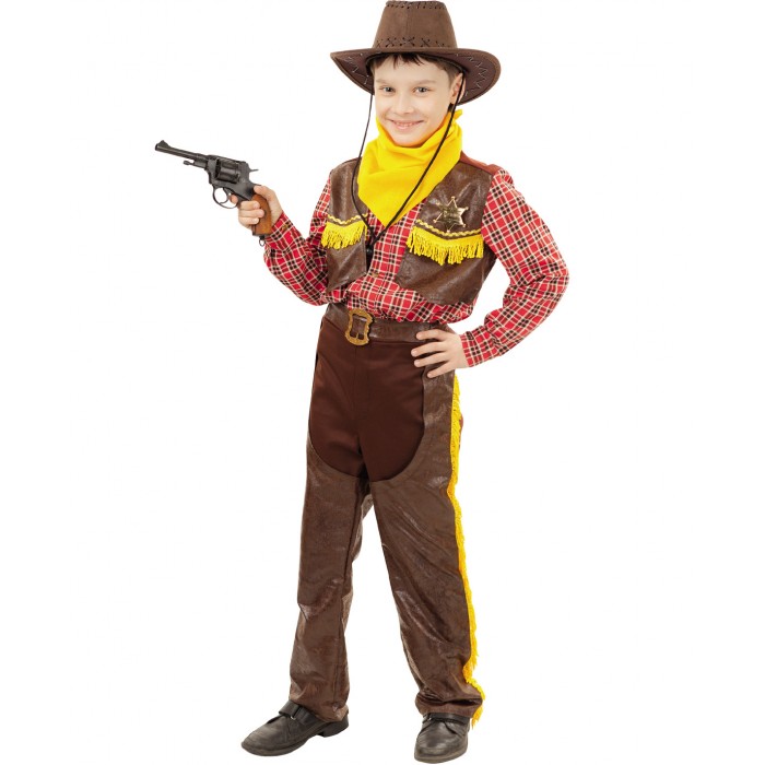 Этот воинственный образ создан специально для неугомонных мальчишек, которые мечтают быть самыми классными персонажами на празднике. Тематика Дикого Запада популярна уже много лет, и вашему мальчику наверняка понравится качественный и реалистичный образ в этом стиле. Образ полностью целостный, продуман от ковбойской рубашки и брюк и заканчивая шляпой и пистолетом.