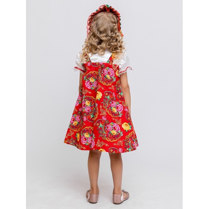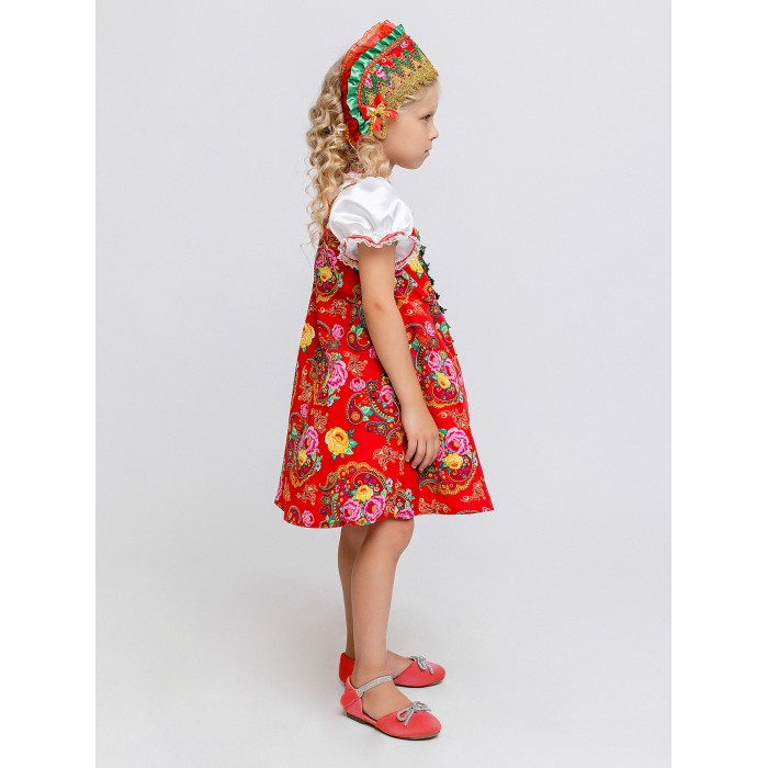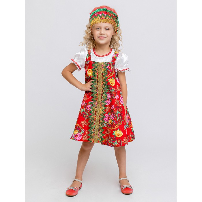 Карнавальный костюм Красна-девица детский: платье и кокошник. Девочка в таком костюме сможет почувствовать себя настоящей сказочной царевной, если она выступает на утреннике, играет в спектакле или просто идет на костюмированный праздник. Платье с короткими объемными рукавами и народным узором.
