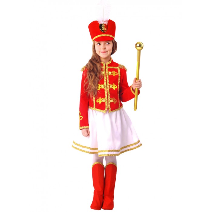 Костюм Мажоретки для девочки, в последнее время, пользуется необычайной популярностью. Мажоретка – девушка в декоративной военной форме, участвующая в музыкальном параде, танцующая или играющая на музыкальном инструменте. В костюме Мажоретки можно отправиться на детский Хэллоуин, а также новогоднюю елку. В комплект костюма входит мундир, юбка, сапоги, кивер и жезл.