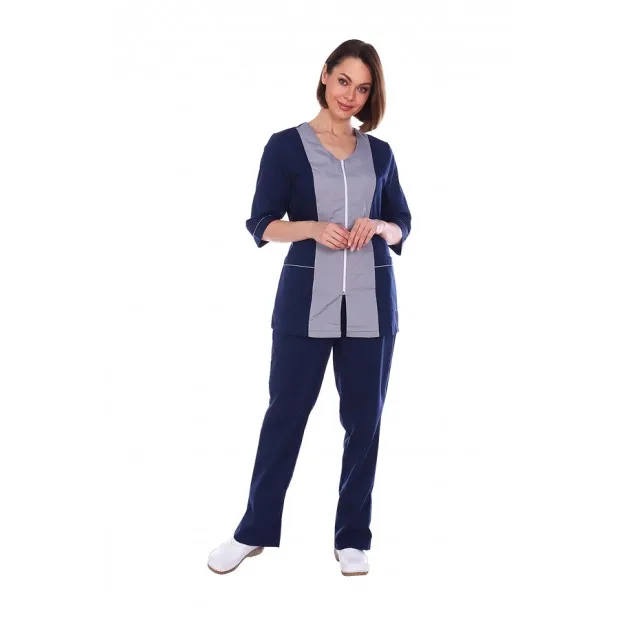 Костюм медицинский женский "Юланта" полуприталеного кроя состоит из куртки и брюк. Куртка с рельефами по полочке, выполненная из плечевых швов. Горловина V-образная без воротника, рукава 3/4, два накладных кармана внизу. В нижней части куртки в боковых швах разрезы. Ширина регулируется за счет завязывающихся на спинке полупоясов, выходящих из боковых швов. Брюки свободные, прямые на резинке. Резинка частично круговая, передняя часть без резинки - для наилучшей посадки в области живота. Передняя часть брюк отстрочена, имитируя вертикальные стрелки. Низ брюк подшит в чистый край широкой подгибкой. Костюм предназначен для медицинских работников и работников сферы обслуживания.