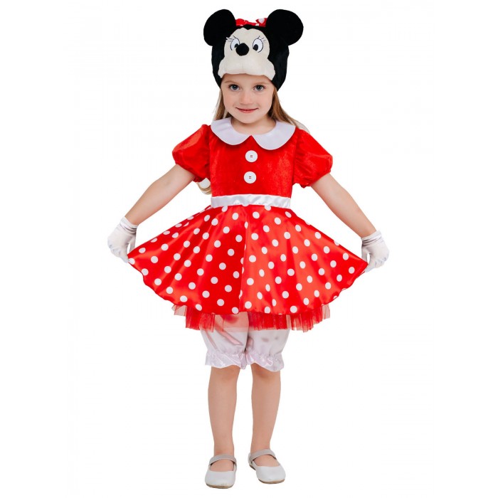 Костюм Минни Маус для детей - яркий образ для самых разных праздников. В комплект входит красное платье, белые панталоны и шапка-маска. Универсальный размер для девочек от 3 до 5 лет.