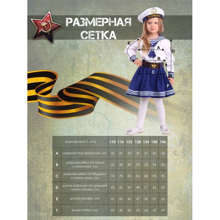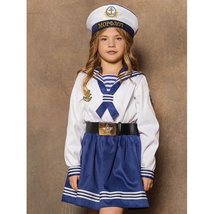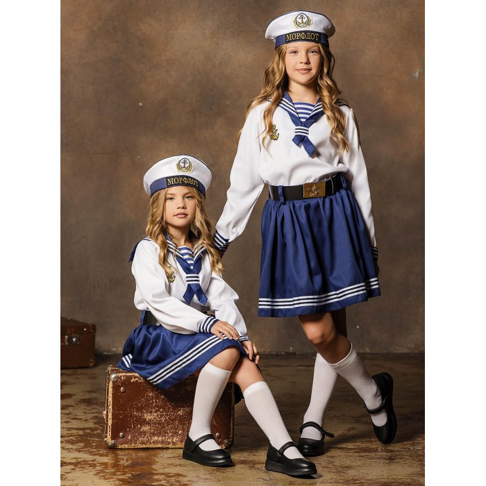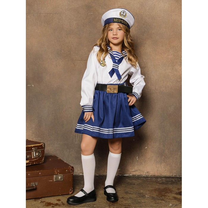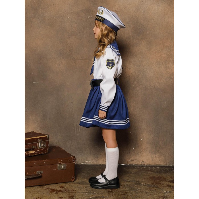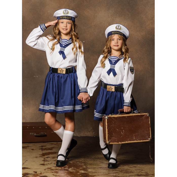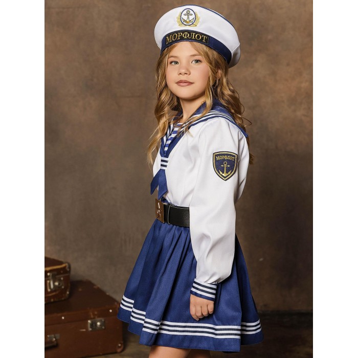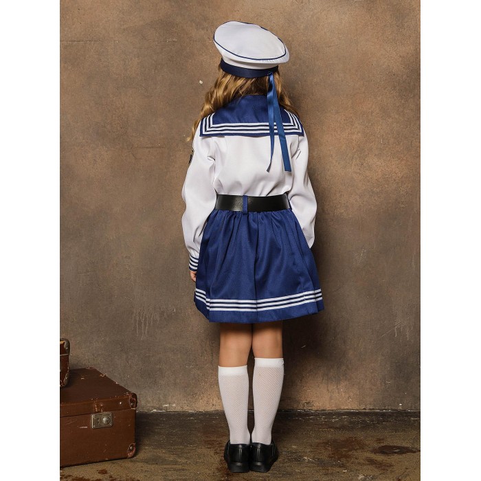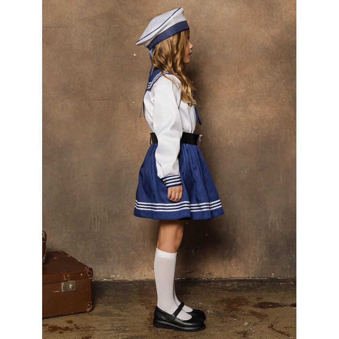 Такой костюм - отличный способ поздравить с такими праздниками, как день Военно-Морского Флота, а также 23 февраля и 9 мая. Также образ будет актуален и на другие праздники в качестве сценического костюма для выступлений и номеров. В комплект костюма входит рубашка, юбка, ремень и бескозырка.