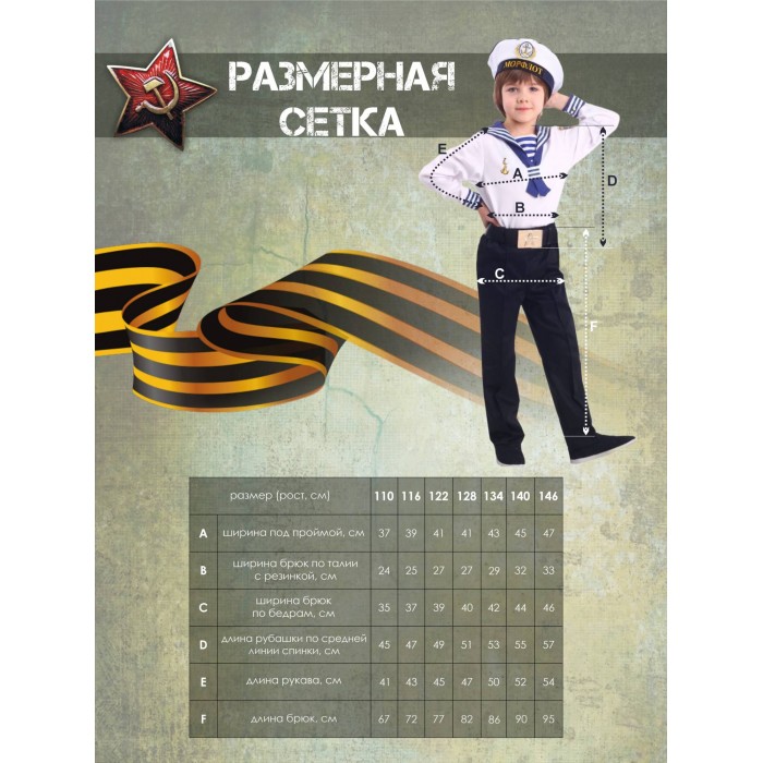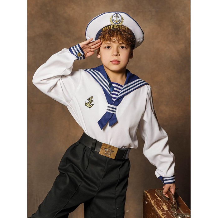 Моряки - это смелые ребята, связавшие свою жизнь с морем, вызывающие восхищение и огромное уважение. Костюм Моряка для мальчика отлично подойдет для празднования Дня Военно-Морского Флота, а также таких праздников как 23 февраля, 9 мая, Новый год. Это прекрасный способ поздравить папу или дедушку, а также интересно и ярко отметить праздник, участвуя в детском параде, спектакле или представлении. В комплекте образа рубашка, брюки, ремень и бескозырка.